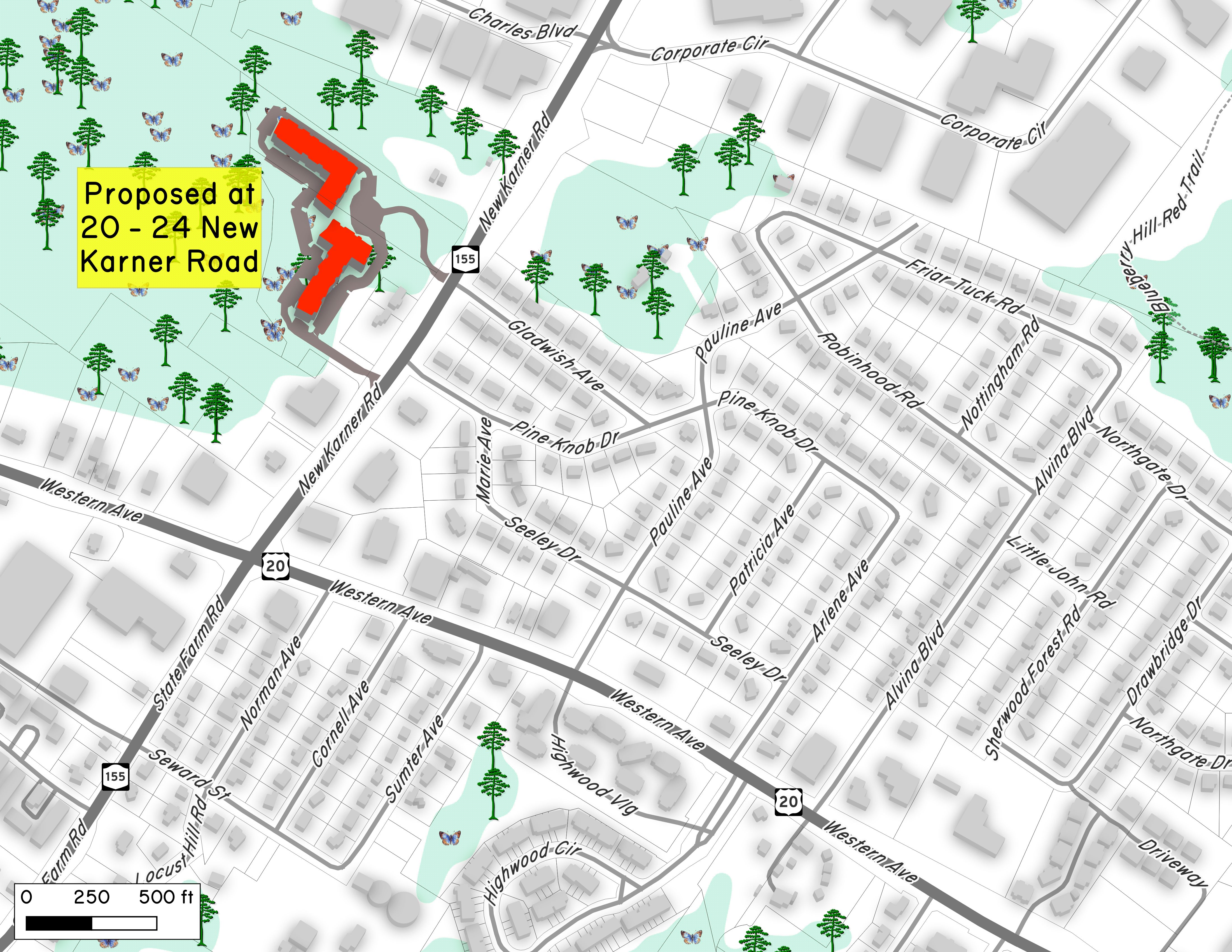 People can view a map of the proposed site by visiting savethepinebush.org/m to view the Mapper. The proposed project is made up of four parcels of land. These parcels are 20, 22, and 24 New Karner Rd (there is an additional tiny .15 acre parcel with no street number). To view a parcel, enter the address of 20 New Karner Rd and the Mapper will display an outline of the parcel. Roll your mouse over adjacent parcels to view the other parcels in the project.